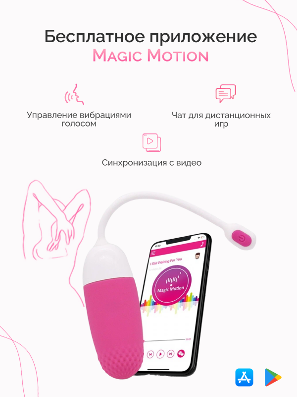 Если, использовать виброяйцо с приложением "Magic Motion", Вам откроется масса новых режимов, голосовое управление, вибрация в такт Вашей музыке, а также специальный чат, в котором Вы с партнером сможете обмениваться откровенными фото и видео!